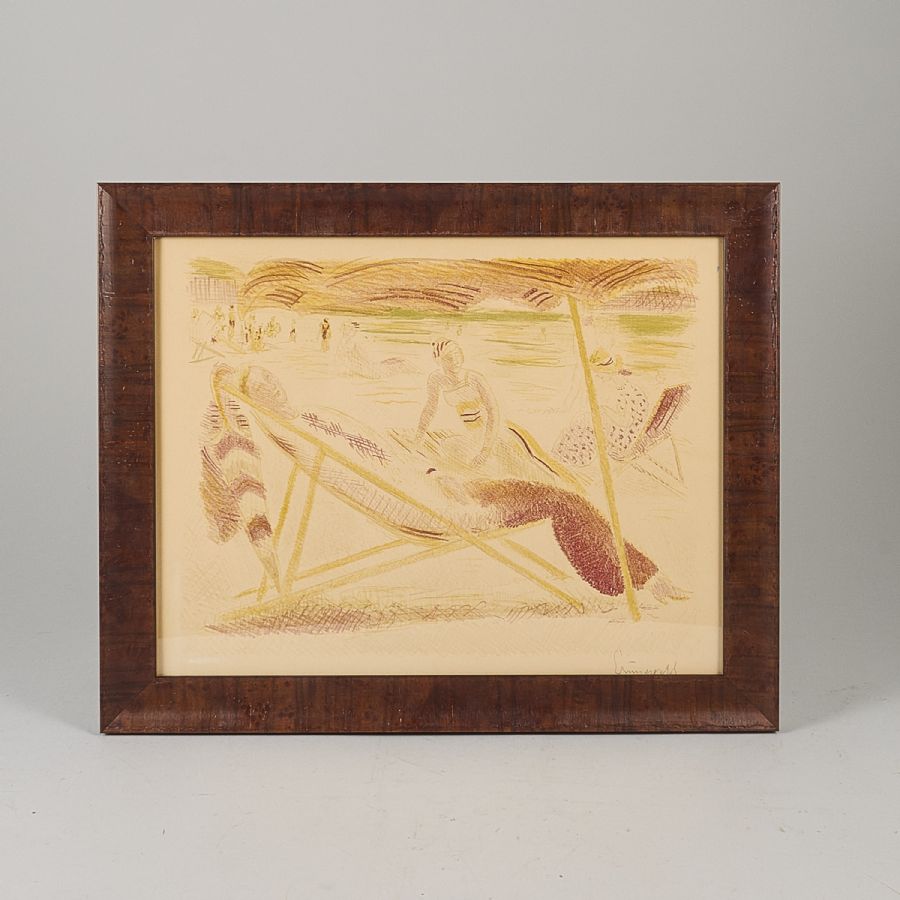 "På stranden". Färglitografi, bildmått: 34x44 cm, yttermått inklusive ram: 42x52 cm. Signerad