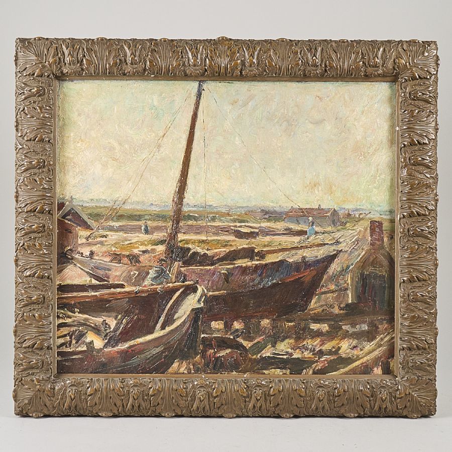 Romain Looymans. Barques sur Chantier. Signerad. Olja på duk, 46x52 cm, yttermått inklusive ram: 58x65 cm