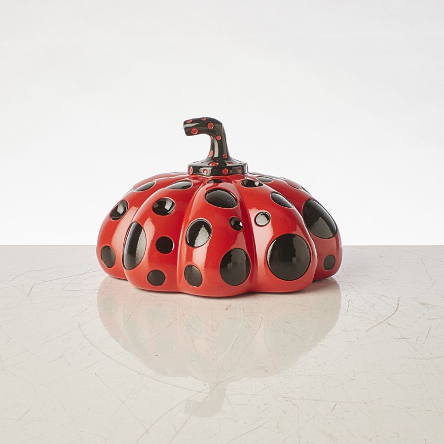 Yayoi Kusama (b. 1929), Japan. "Red Pumpkin, Naoshima". Objekt i gjuten resin. Form av en pumpa i rött och svart. Multipel. Length: 14 cm. Width: 14 cm. Height: 9. 5 cm. Utgiven av Benesse Holding Inc, Naoshima, Japan. Originaletui medföljer (lådan mäter 17x17x10. 5 cm),