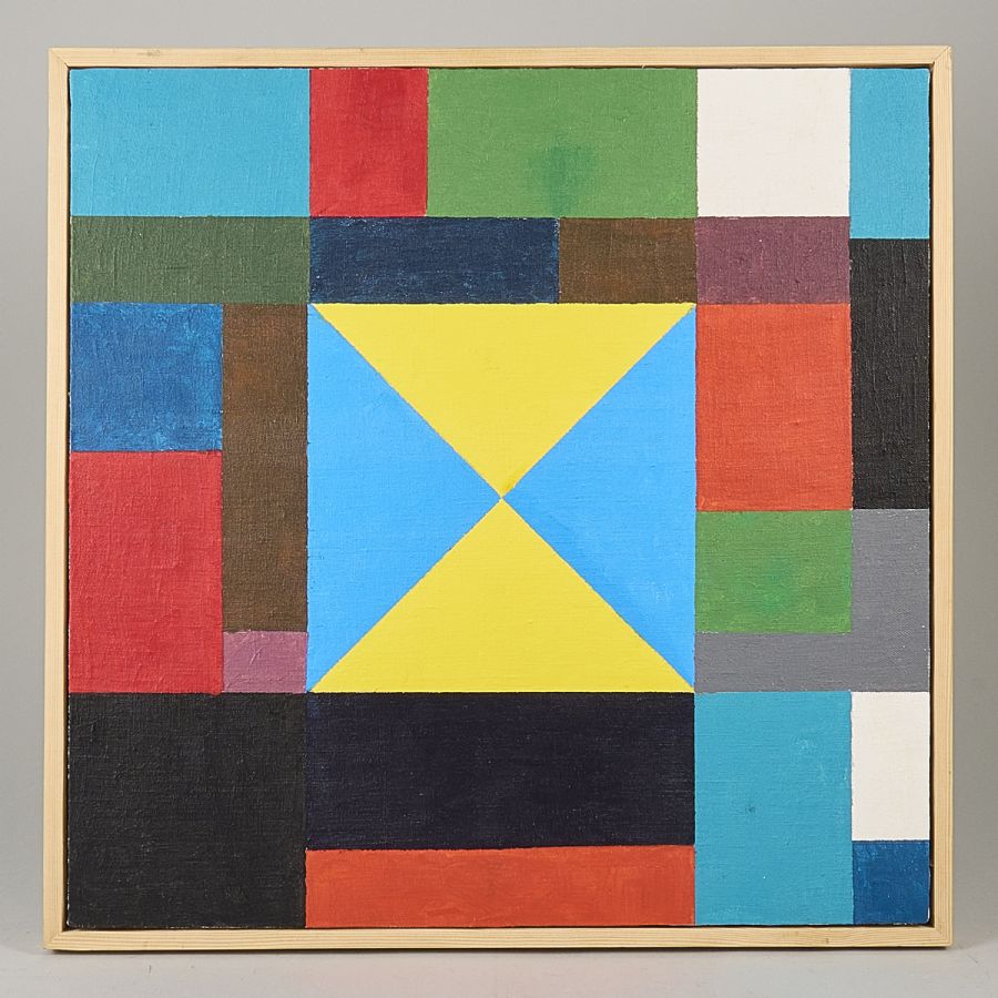 Oidentifierad konstnär. Signerad a tergo inkl. Fingeravtryck, Geometrisk komposition. Olja på duk på pannå, yttermått inklusive ram: 58x58 cm