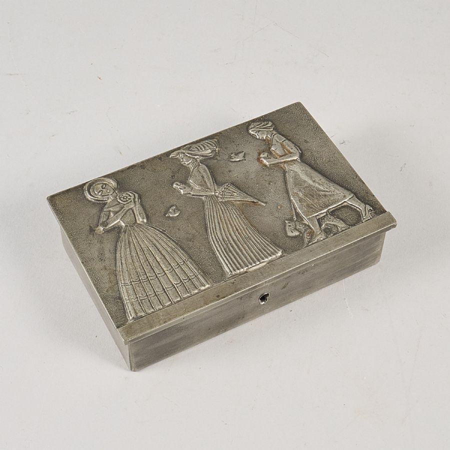 Tenn, GAB Guldsmedsaktiebolaget, 1938, reliefdekor med kvinnor. Längd: 13 cm. Djup: 8,5 cm, höjd: 3 cm