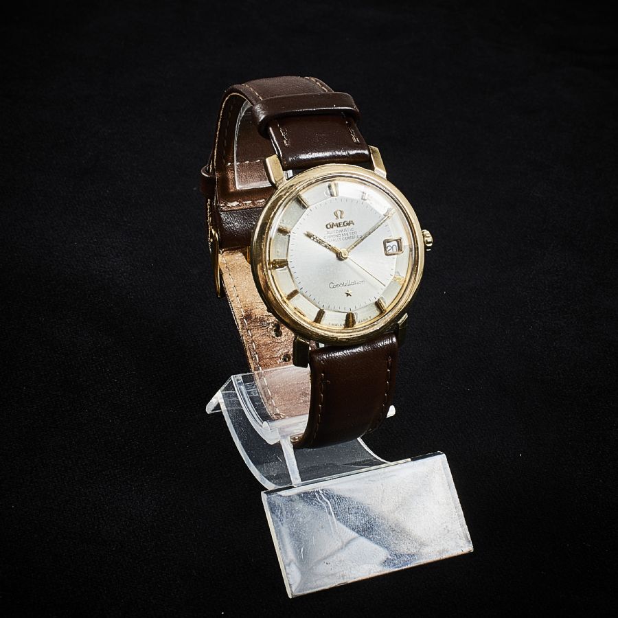Omega Constellation, Automatic, 18k guld. Armband i läder. Diameter: 3,5 cm (boetten), Längd: 23 cm (totalt)