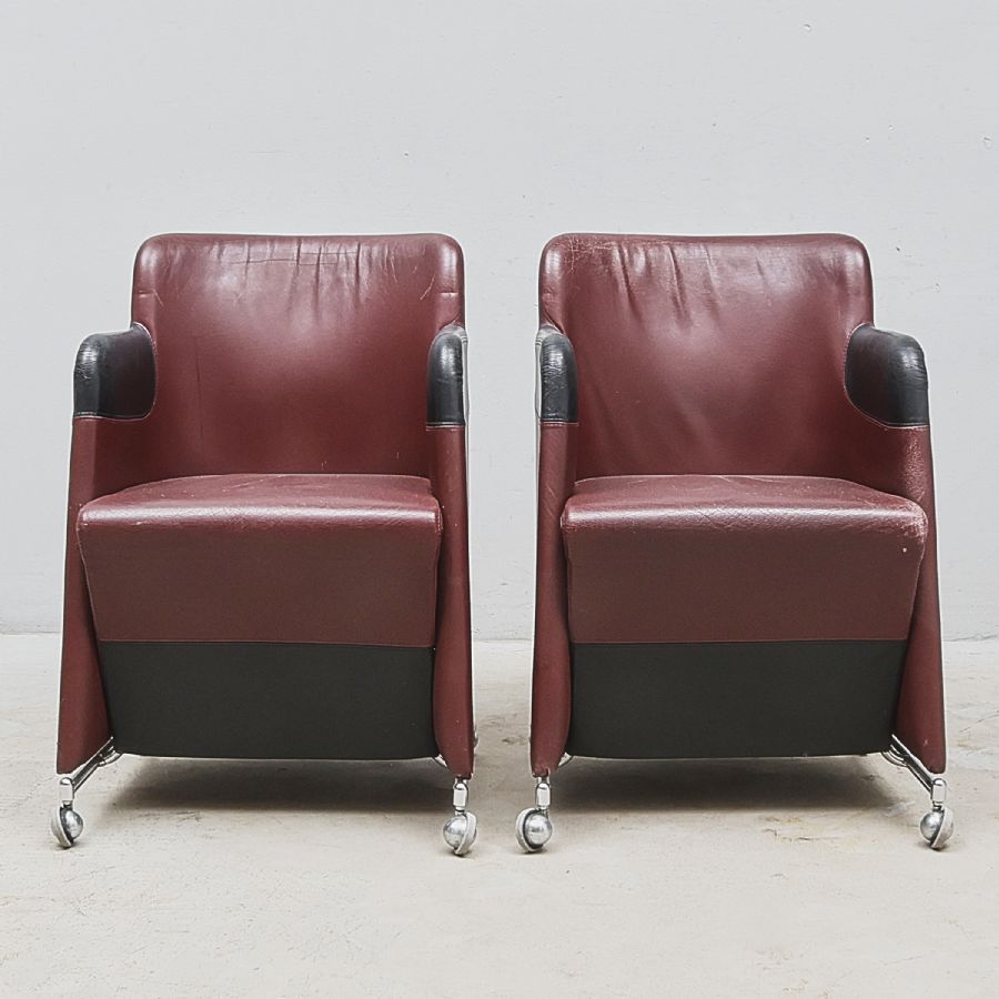 Ett par, Börge Lindau & Bo Lindekrantz, Lammhults, "Solo", skinn i vinrött med svarta armlän, trissor på kromad benställning