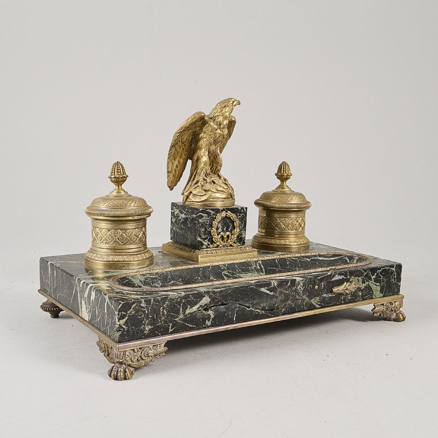 omkring 1900, marmor / mässing, dekor med örn, lejontassar. Längd: 30 cm. Djup: 18 cm. Höjd: 20 cm