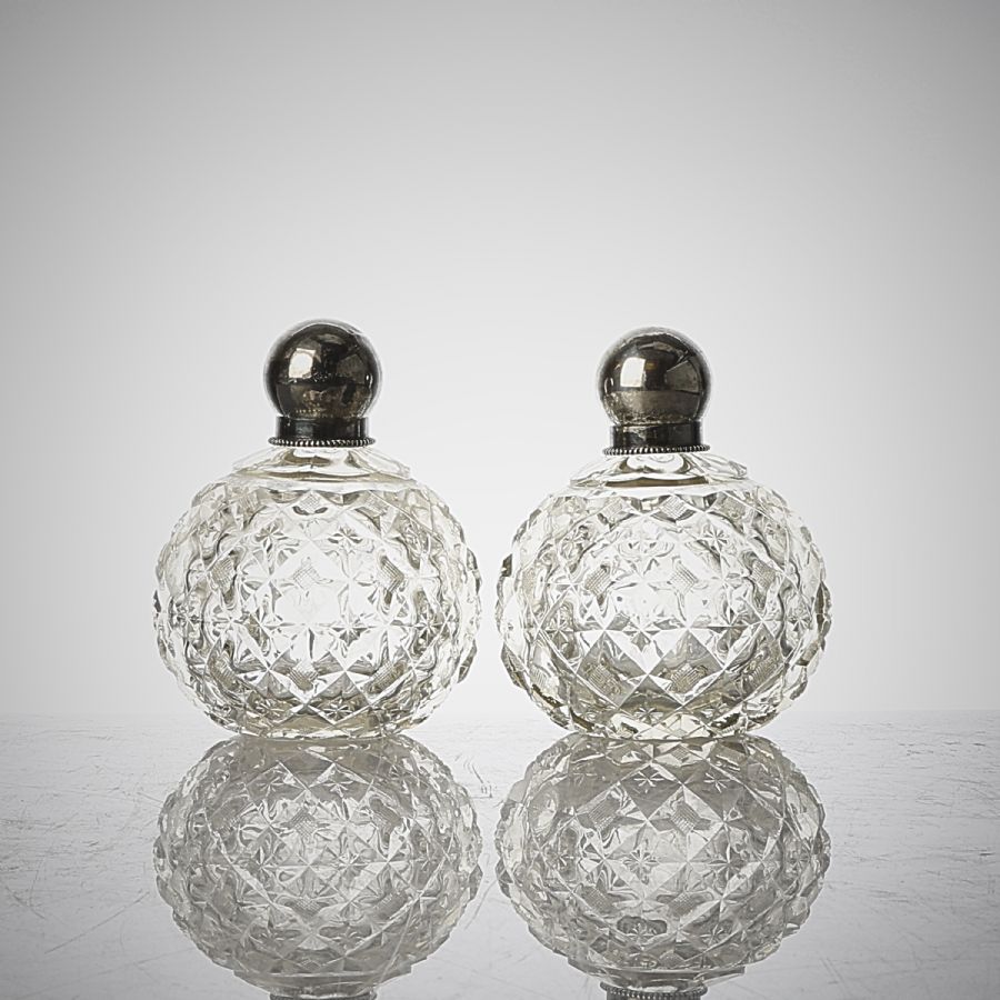 Ett par, med proppar i silver (800), slipad dekor, glas. Höjd: 13 cm. Brutt. Vikt: 975g