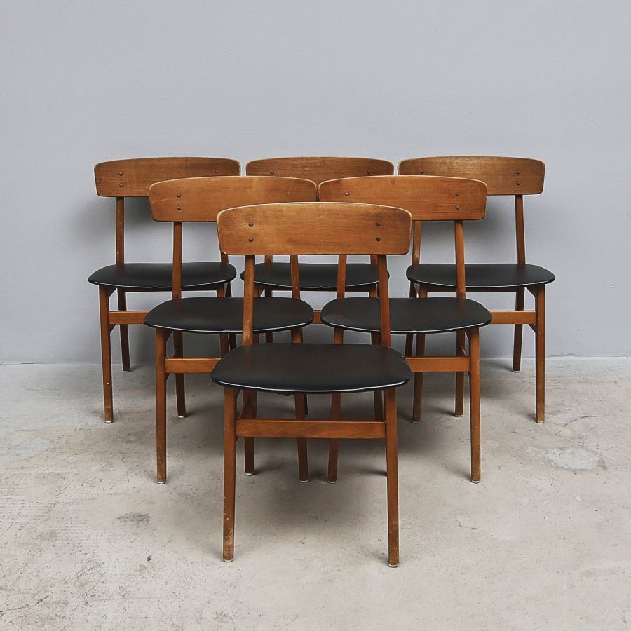 6 st, Fastrup, Danmark, teak, med sits i svart galon