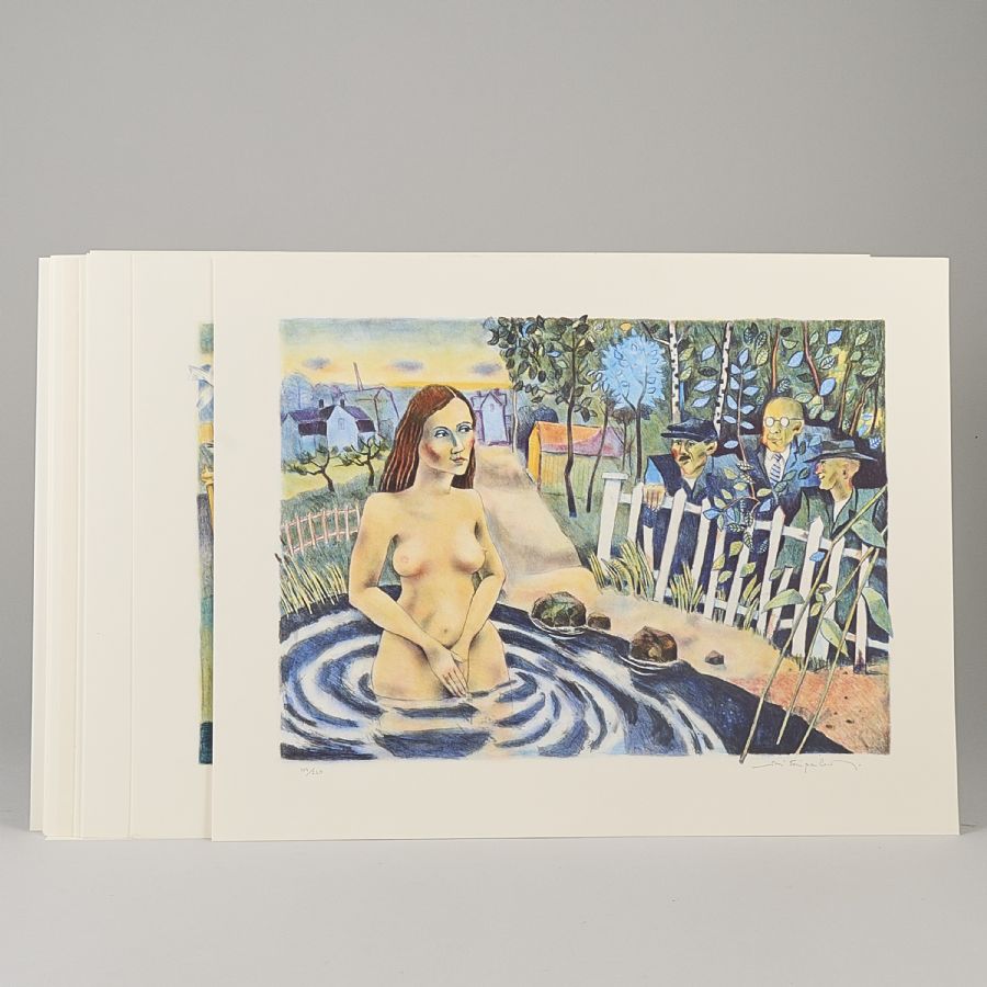Färglitografier, 20 st, Jussi Taipaleenmäki (f. 1948). "Hommage á Cornelis". Signerad, numrerad 104/260, lösa blad i trälåda. Färglitografi. Bladets mått: 43,5x55,5