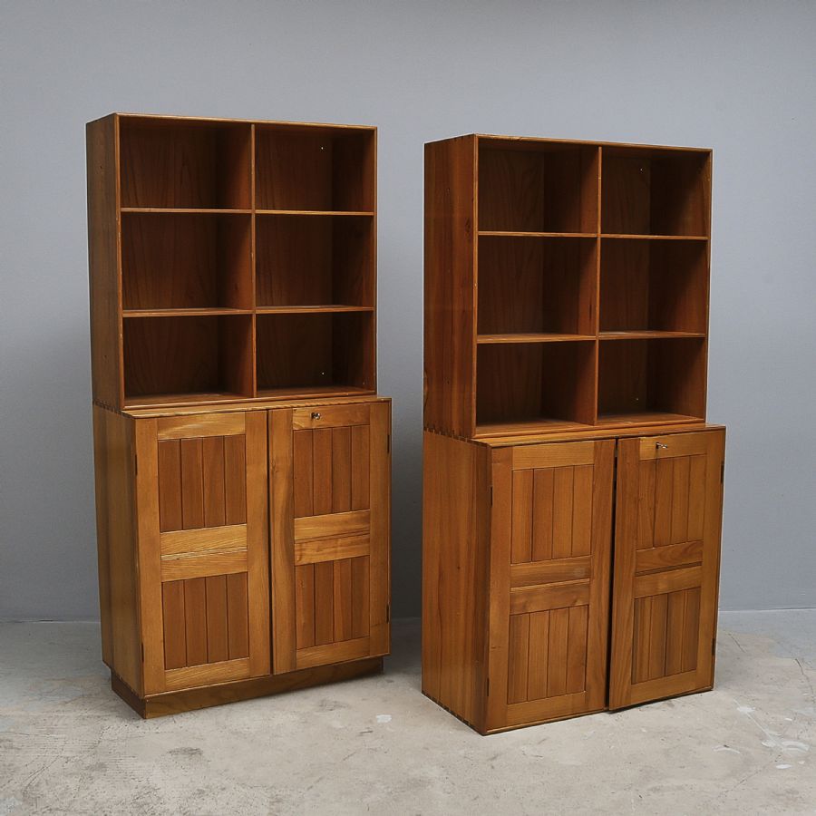 Mogens Koch för Rud Rasmussen, formgiven 1928, "Oregon pine", 2 underskåp samt 2 överskåp, med 4 socklar. Bredd: 76 cm, djup: 27,5-35,5, höjd: 76 + socklar, höjd: 7 cm