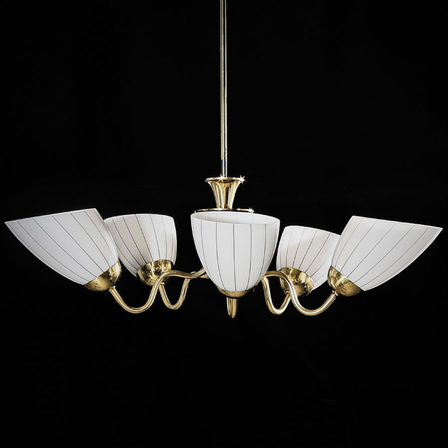 1950-tal, stomme i mässing, 5 ljusarmar med frostade glaskupor. Diameter: 65 cm, Höjd: 74 cm