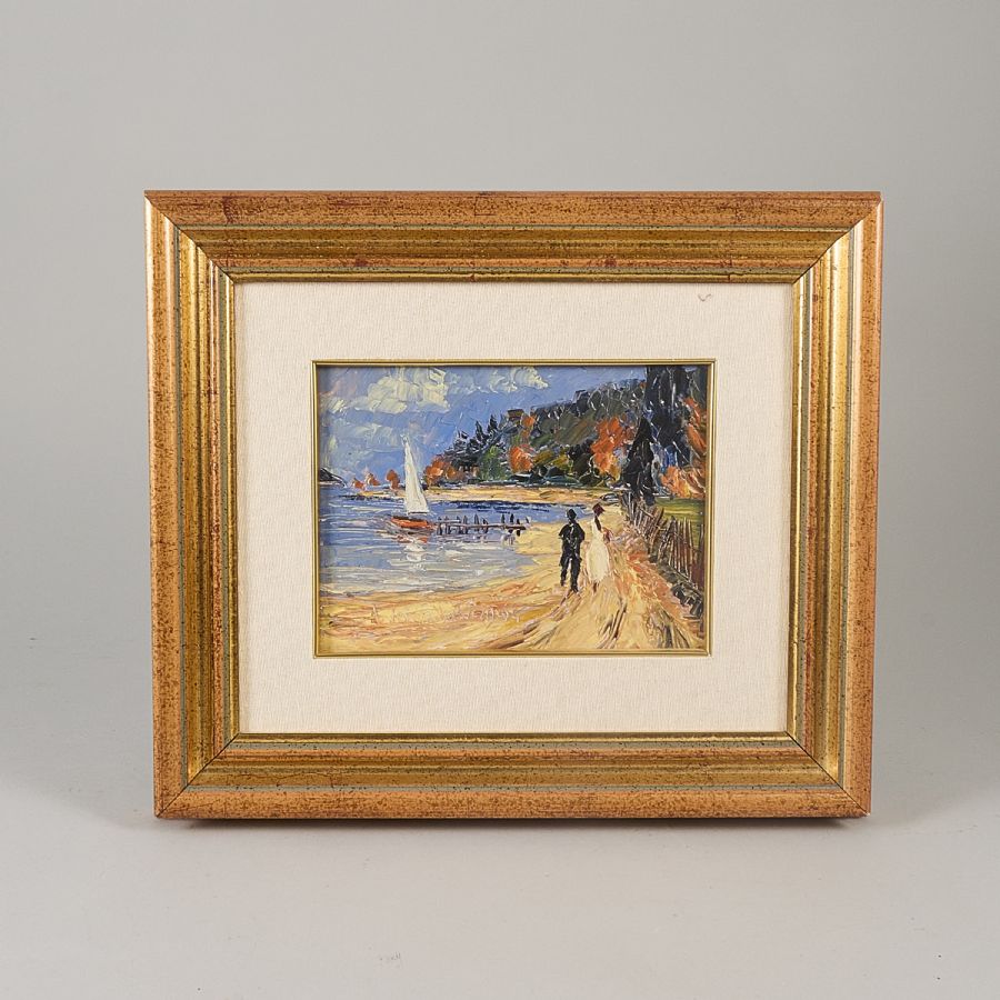 André Poirson, Sjölandskap par och segelbåt. Signed. 17x23 cm, outer dimensions including frame: 38x44,