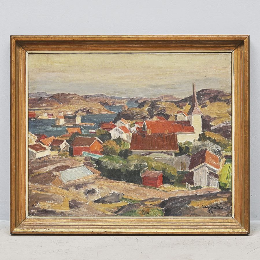 Oljemålning, Signerad, daterad 34, "Motiv från Gullholmen". Olja på duk, 66x80 cm, yttermått inklusive ram: 78x93 cm