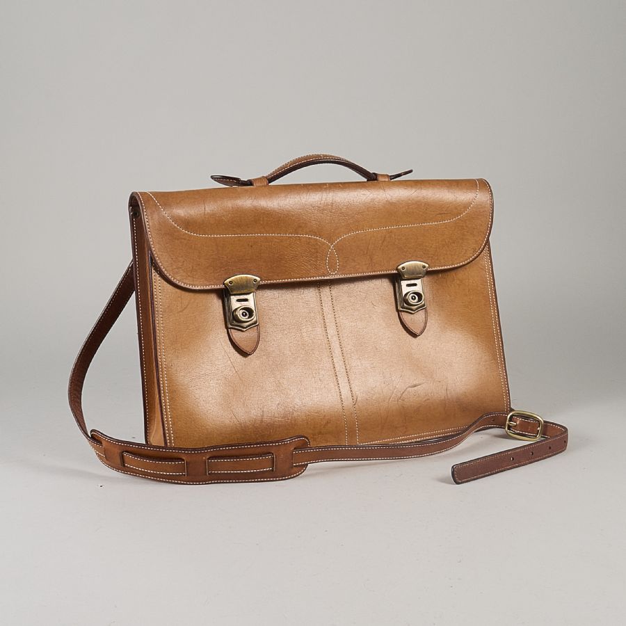 Bölebyns Garveri, garvat läder, med axelrem, två innerfack, hållare för pennor, två ytterfack, mässingsspänne, monogram E. W, märk nr. 108. Width: 42 cm, height: 34 cm, wear.