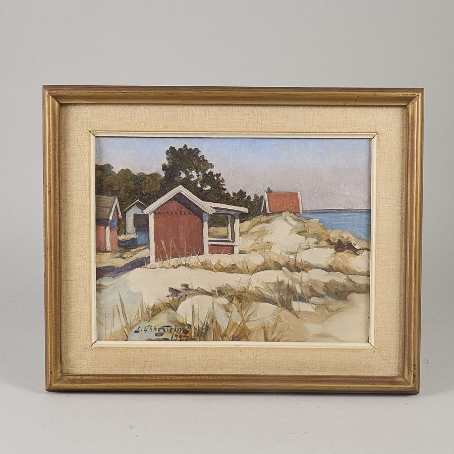 Karl Johan Ebbeström (1892-1957), kustmotiv med hus. Signerad, daterad 1927. Olja på duk, 23x31 cm, yttermått inklusive ram: 35x43