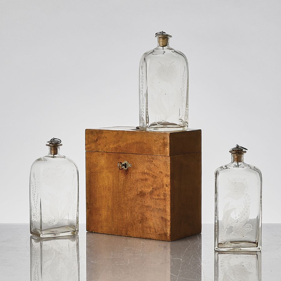 låda i björk, 3 glasflaskor med propp och etsad dekor, Orrefors Glassworks, Sweden. Length: 21, 5 -. Height: 22 cm,