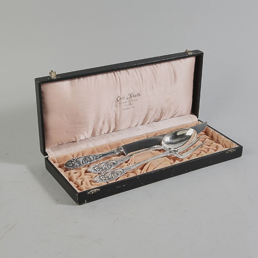 silver, 3 delar, Magnus Aase. Norge, dekor av trana, Längd: 23-32 cm, bruttovikt: 260 g ca, varav kniv med skaft i silver, blad i rostfritt stål 118 g