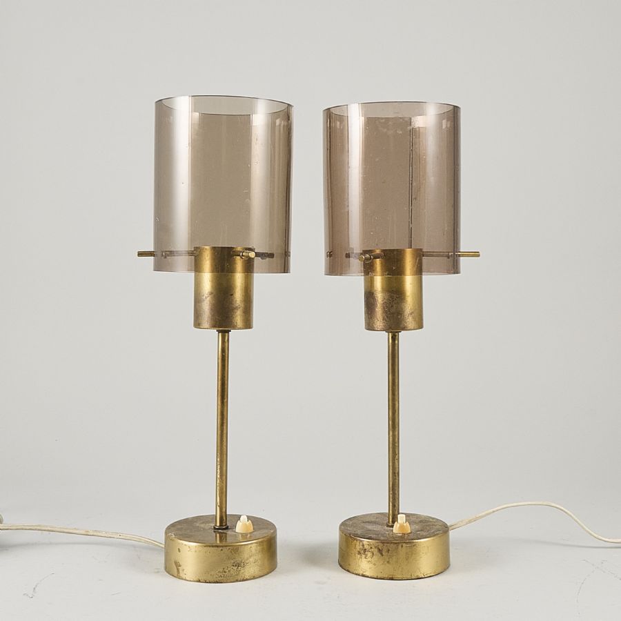 Ett par, Hans Bergström, Philips, "Topas", fot i mässing, skärm i rökfärgad akrylplast. Diameter: 2 cm. Höjd: 40 cm