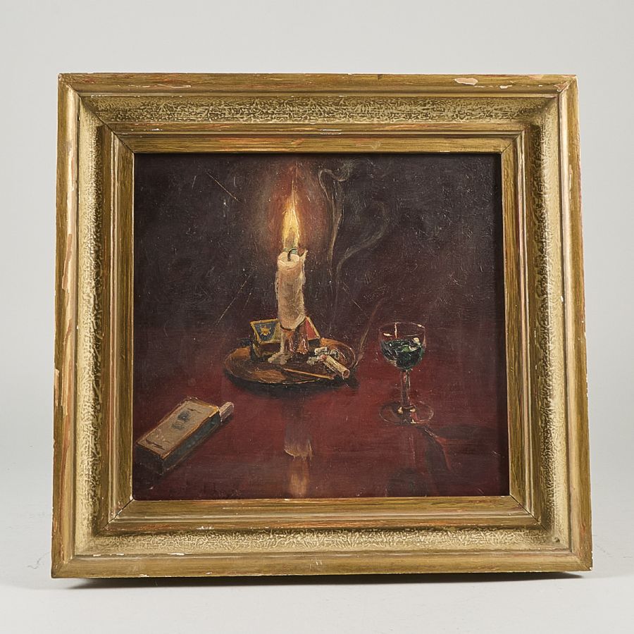 signerad Lambert L, otydlig datering, stilleben med ljus. Olja på pannå, 30x30 cm, yttermått inklusive ram: 40x43 cm
