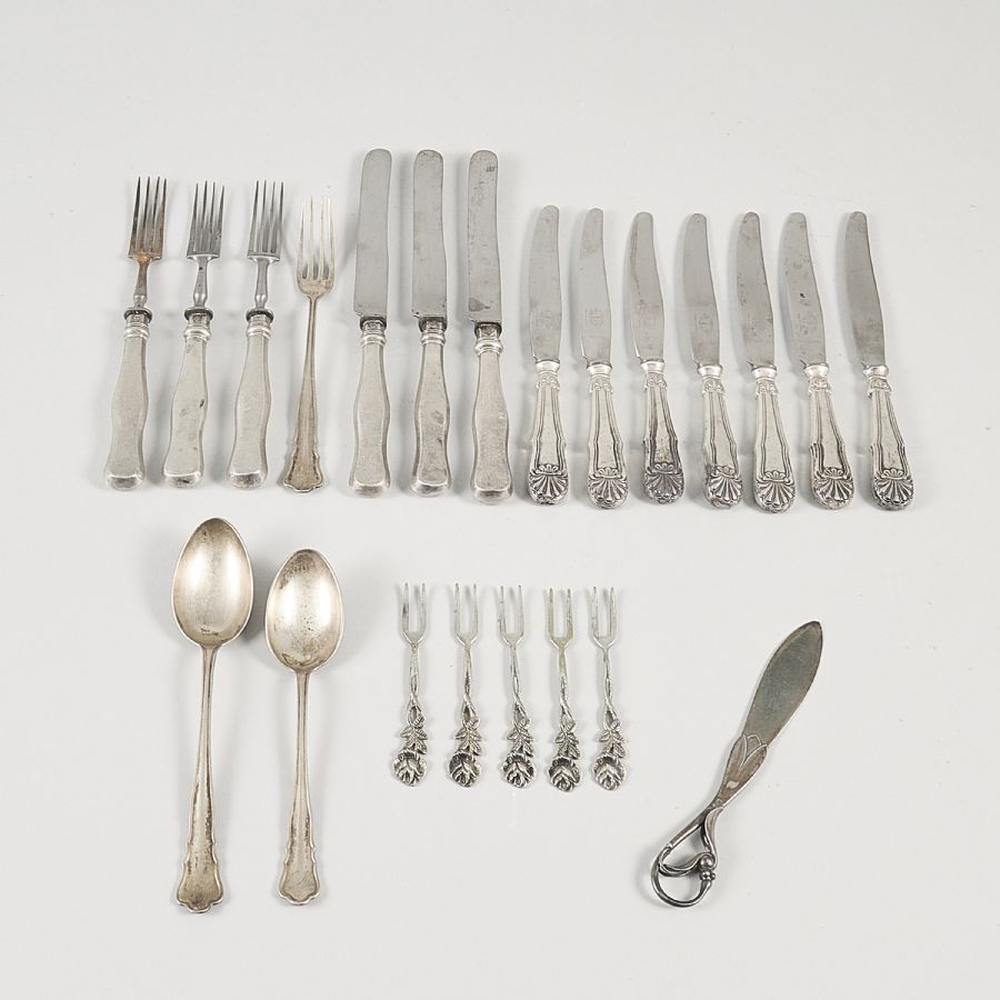 22 st, blandat knivar/gafflar/skedar, silver, Bruttovikt: 550 g ca, varav knivar och gafflar med blad i rostfritt stål 410 g