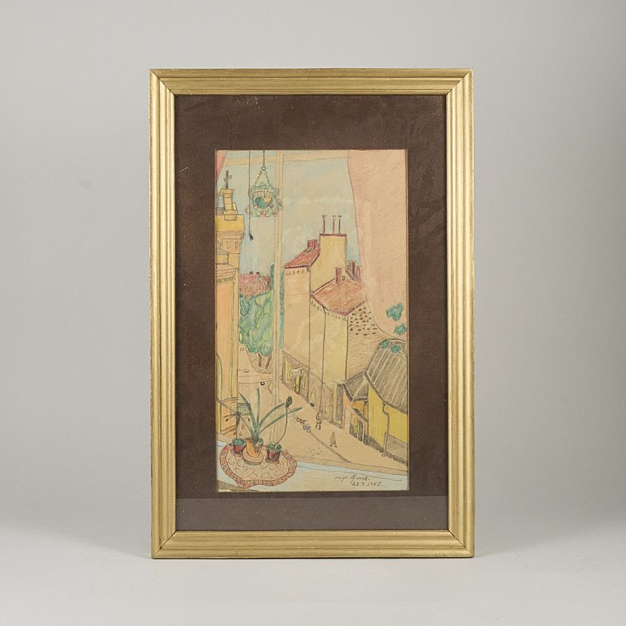 Oidentifierad konstnär. Signerad, daterad 1945, "vy från Industrig 3, Kungsholmen", 47x26 cm, yttermått inklusive ram: 65x43 cm