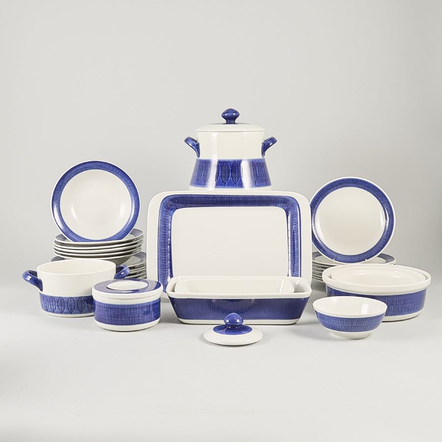 29 pieces, Koka Blå, Hertha Bengtson (1917-1993), Sweden. Rörstrand, Sweden, porcelain, dekor med blå rand på vit botten,