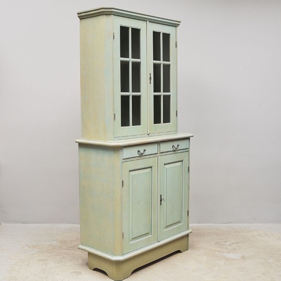 två dörrpar varav ett med glas, bakomliggande hyllplan, två lådor, nutida, grönt, delbart, Bredd: 92 cm. Djup: 42 cm. Höjd: 186 cm