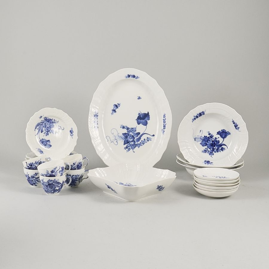 17 delar Royal Copenhagen, Blå Blomst, porslin, 6 kaffekoppar med fat, 6 assietter, 3 djupa tallrikar, serveringsfat, skål. Längd: 20-36. Diameter: 7,5-22 cm