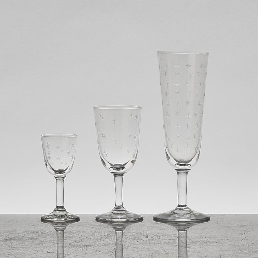 Glasservisdelar, 19 st, Reijmyre Glasbruk, etsad dekor av stjärnor, 5 champagneglas, 9 starkvinsglas, 5 sherryglas. Höjd: 9-17 cm