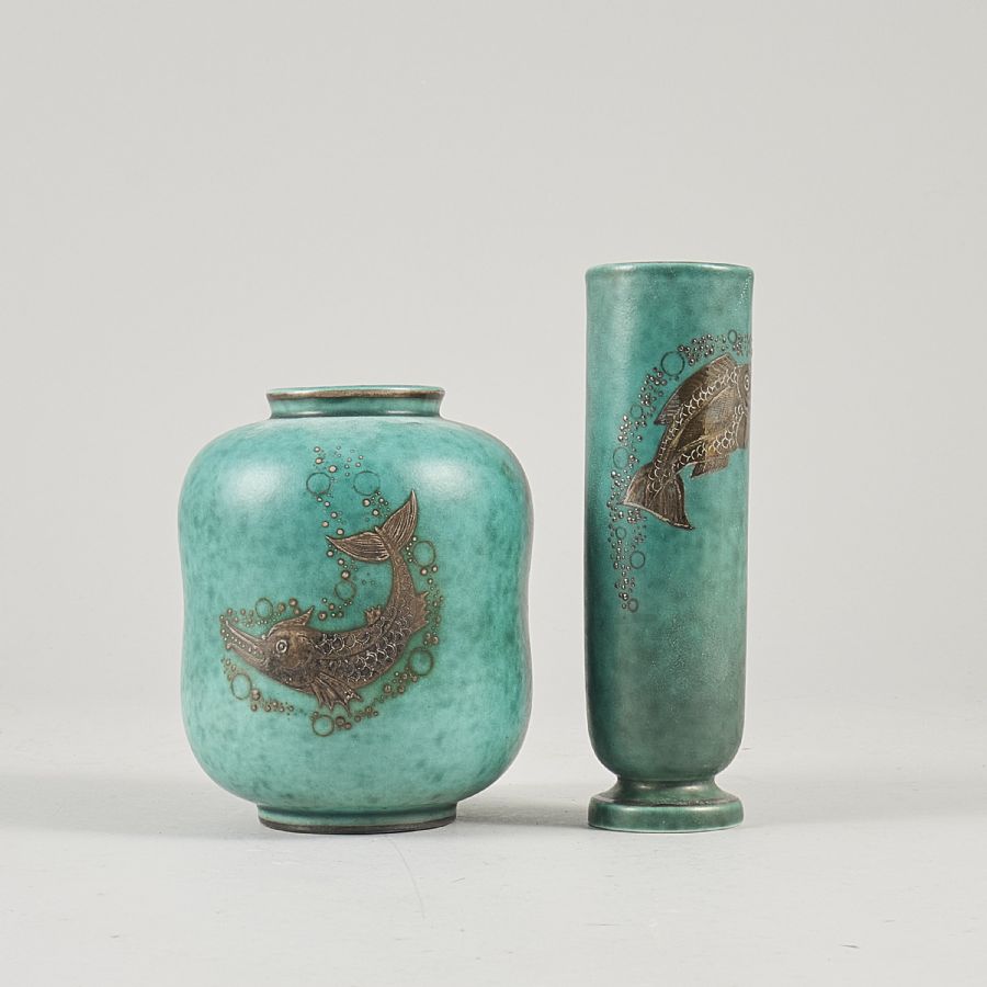 Vaser, 2 st, Argenta, Gustavsberg. Stengods, grön glasyr med målad silverdekor. Höjd: 12-15 cm