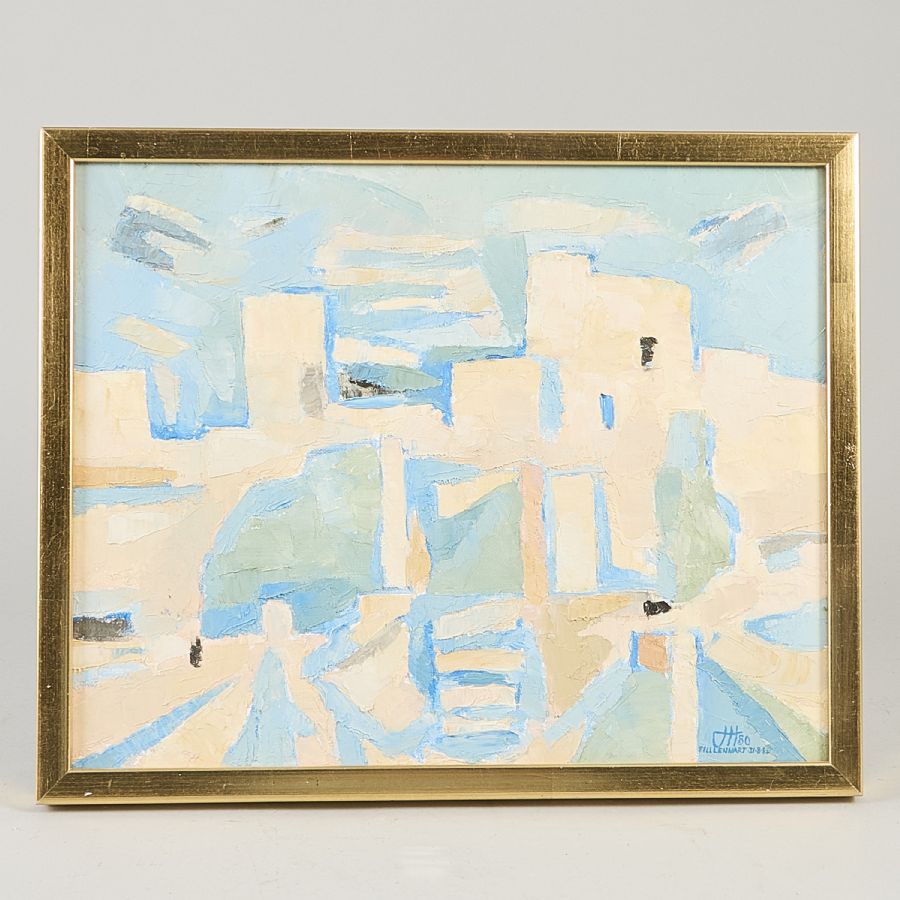 Oljemålning, Signerad, daterad -82, med dediktaion "Till Lennart (Gram) ", stadsbild. Olja på pannå, 32x39 cm, yttermått inklusive ram: 36x43 cm