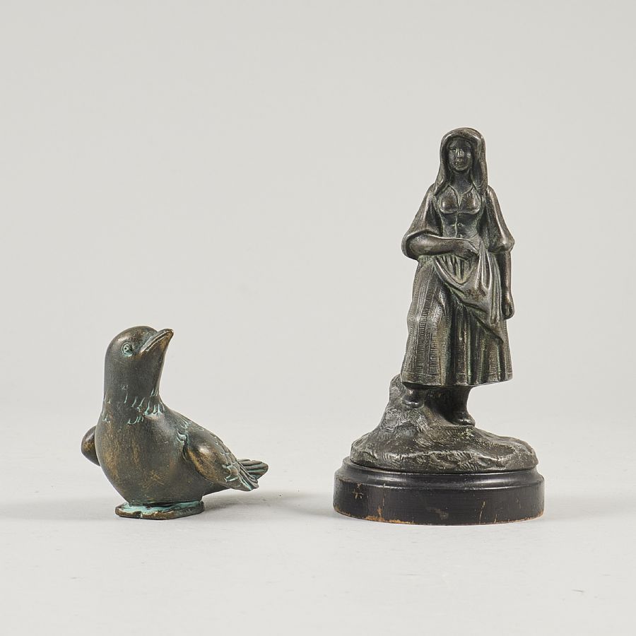 2 st, kvinna på träsockel, fågel, metall, bronserade. Höjd: 7-15 cm