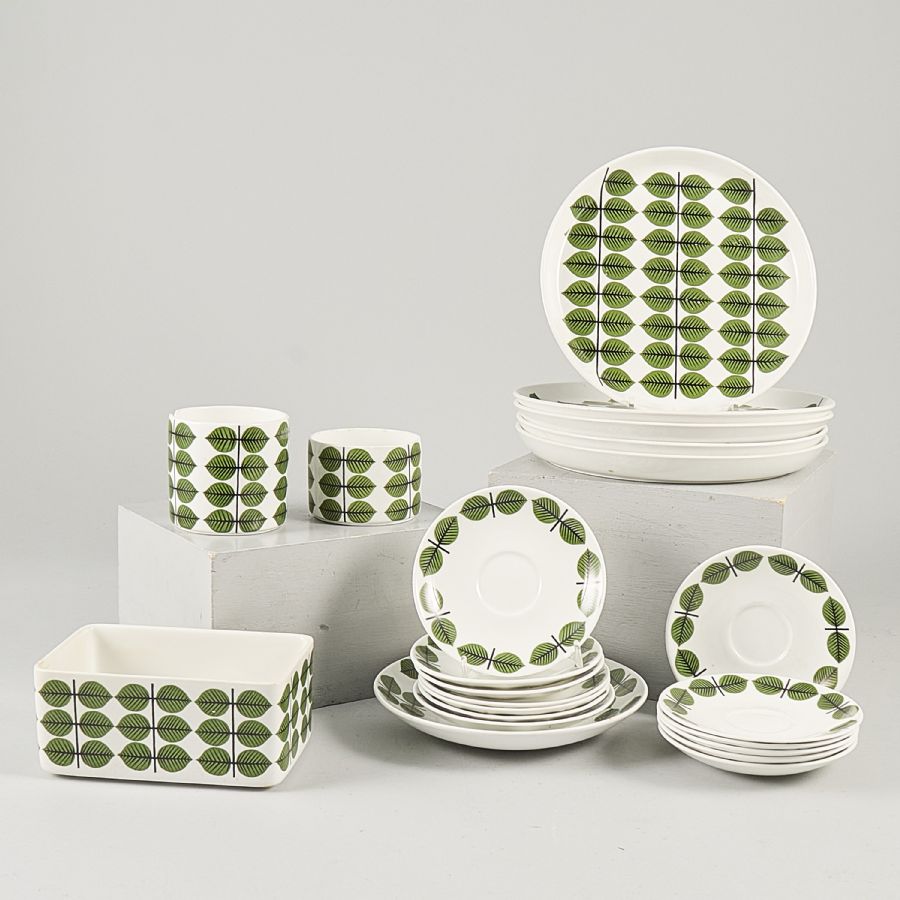 Servisdelar, 8 delar, Berså, Gustavsberg 1960-1974. Stiliserade gröna blad på vit botten. Mönstret ritades av Stig Lindbergs assistent Krister Karlmark på uppdrag av Lindberg som var hans lärare på Konstfack, + 14 kaffekoppsfat