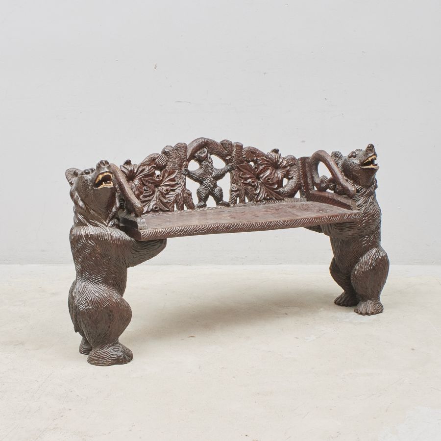 Så kallad "Black Forest", ryggbricka med dekor av björn i skog, gavlar föreställande björnar, skuret i trä. Contemporary production. Length: 120 cm. Height: 67 cm,