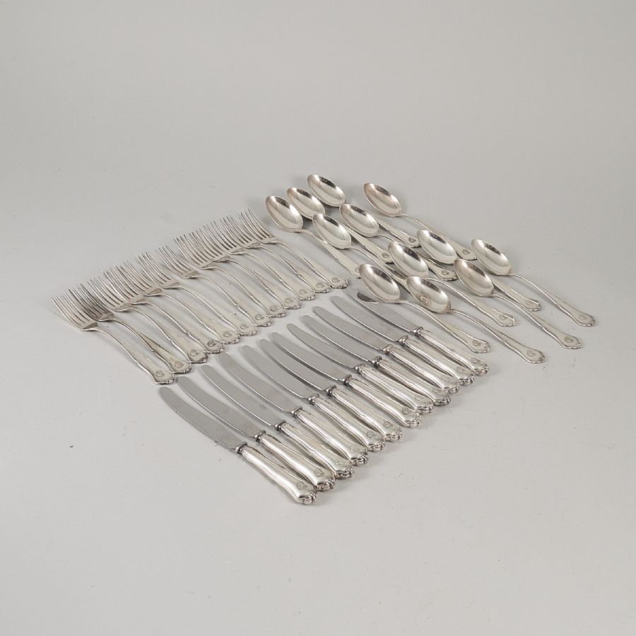 silver, 36 delar (12+ 12+ 12), CG Hallberg, GAB Guldsmedsaktiebolaget, med monogram. Längd: 18,5-20 cm, bruttovikt: 2000 g, varav knivar 800 gr