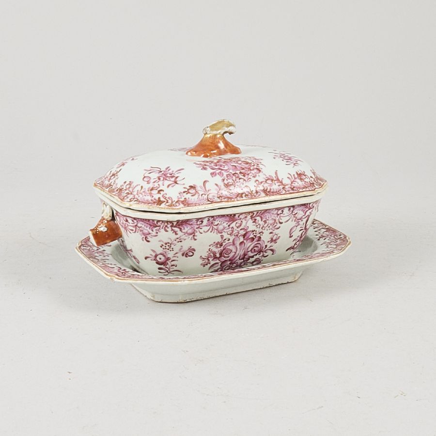 med fat, Kina, hänklar i form av fabeldjur, polykrom dekor. Längd: 20 cm, höjd: 13cm