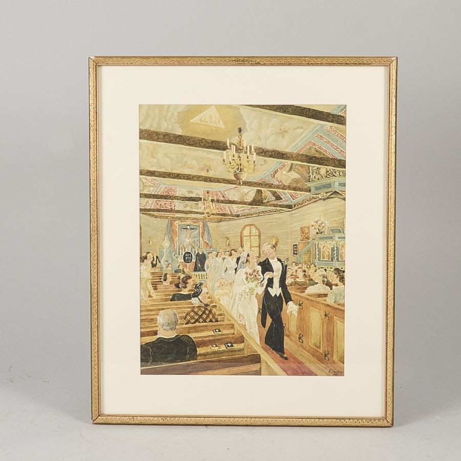 WATERCOLOUR, Signerad, daterad - 41, bröllop i Seglora kyrka. Akvarell, bildmått: 35x26 cm, yttermått inklusive ram: 47x39 cm