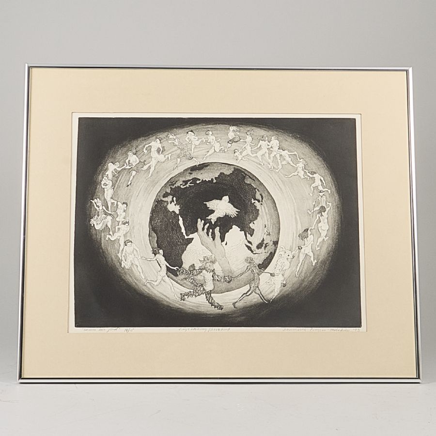 Ann-Marie Erngren Hedström. "Snurra vår jord". Signerad, numrerad 14/15, daterad -83. Etsning, 32x43 cm, yttermått inklusive ram: 49x60 cm