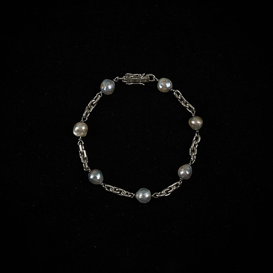 18 k vitguld med 7 pärlor. Längd: 19 cm, vikt: 13,6 gr brutto