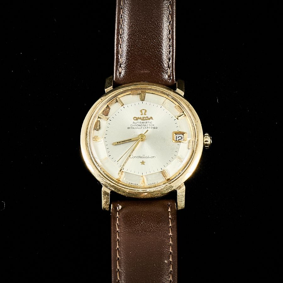 Omega Constellation, Automatic, 18k guld. Armband i läder. Diameter: 3,5 cm (boetten), Längd: 23 cm (totalt)