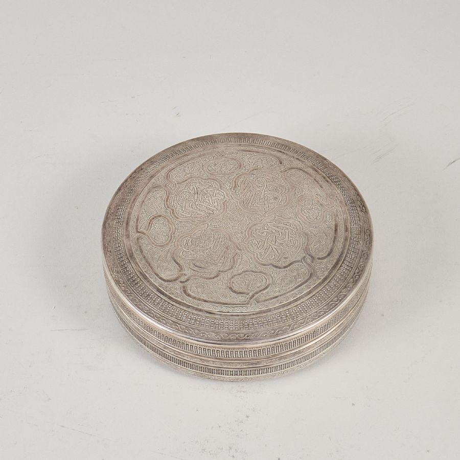 med lock, silver, (800/1000), utländska stämplar (Egypten), reliefdekor, diameter. 14 cm. Höjd: 4 cm. Vikt: 350 g