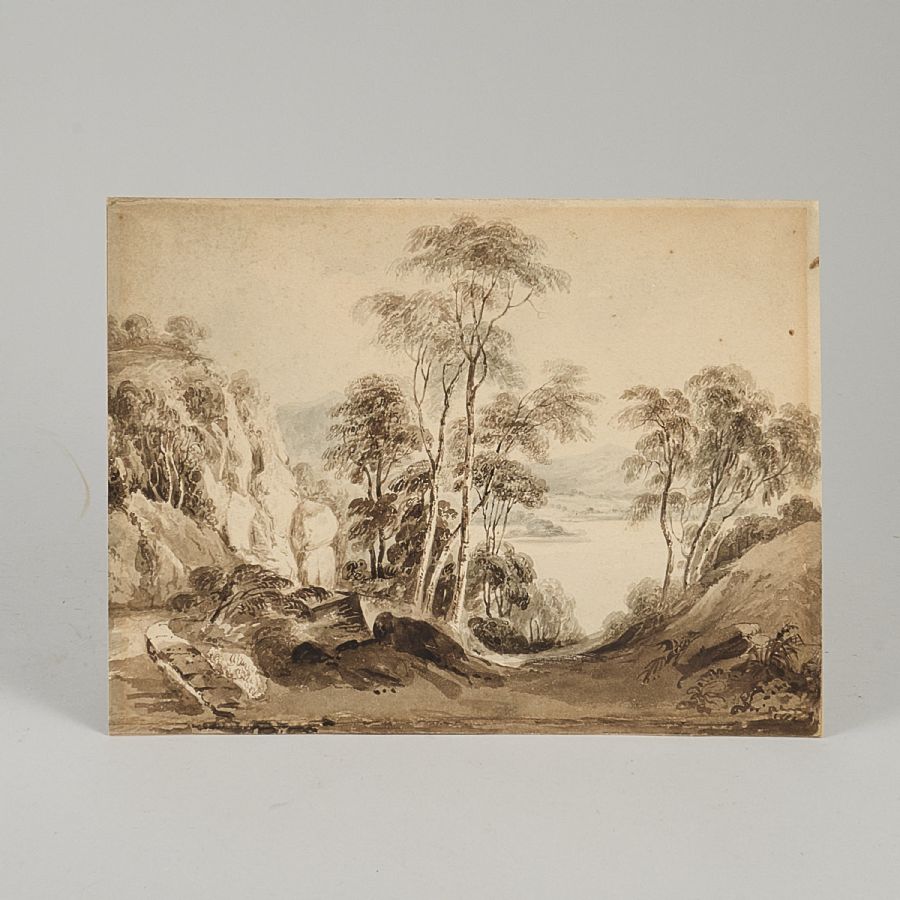 Anthony Devis (2729-1816), tillskriven. Vidsträckt sjölandskap. Ej signerad. Sepia och akvarell på papper lagd på kartong, 25x33 cm. Oramad