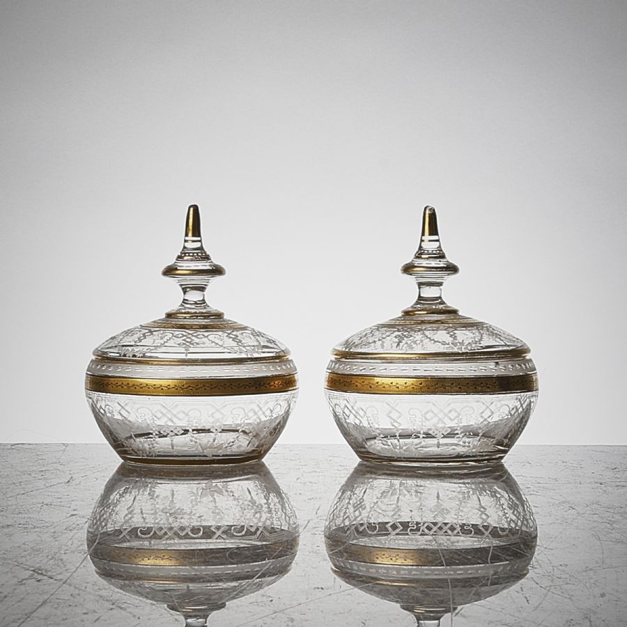 2 st, glas, gulddekor. Höjd: 13 cm