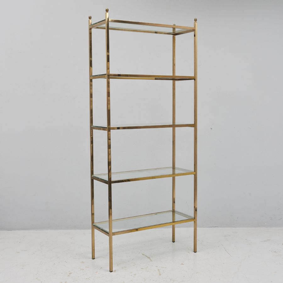 mässing och glas, 5 hyllplan. Bredd: 80 cm. Djup: 34 cm. Höjd: 191 cm