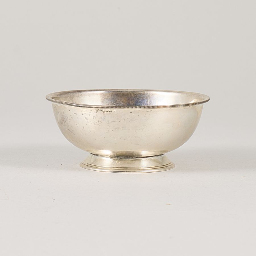 silver, W A Bolin, 1939. Diameter: 12 cm, height: 5, 5 cm, weight: 140 gr ca, dented.
