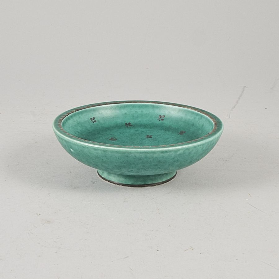 Skål, Argenta, Gustavsberg. Stengods, grön glasyr med målad silverdekor. Diameter: 15 cm