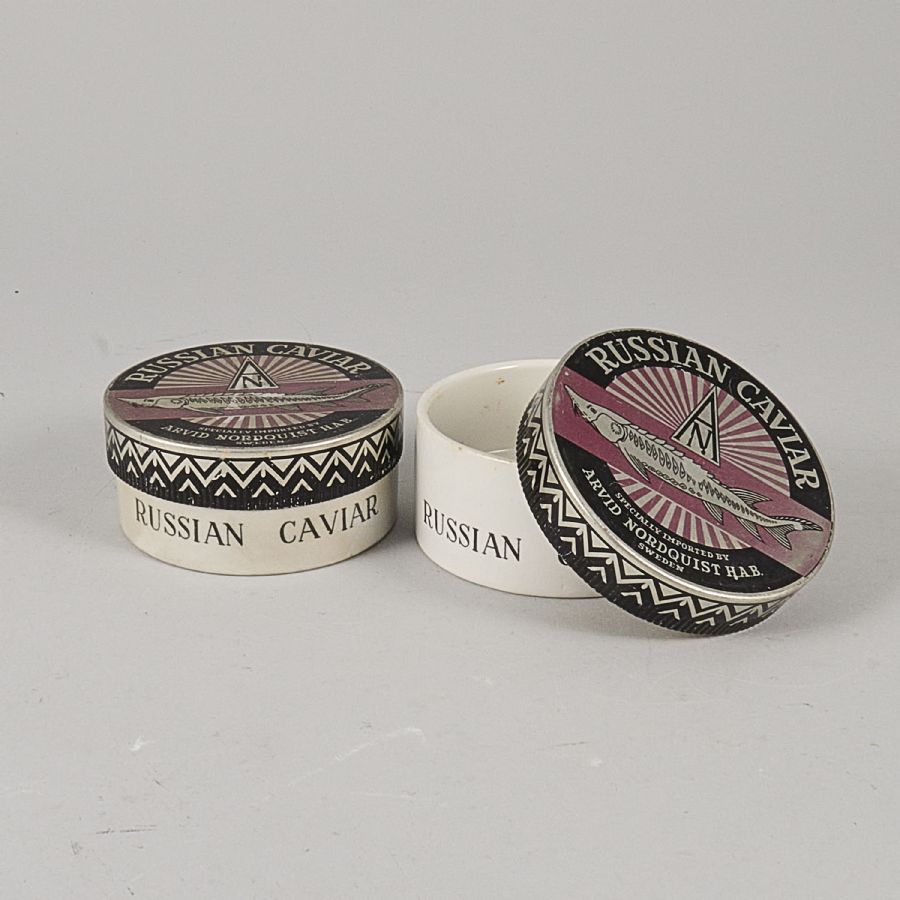 med lock, Arvid Nordquist, Russian Caviar, porslin med lock i tryckt plåt. Diameter: 10 cm. Höjd: 4,5 cm