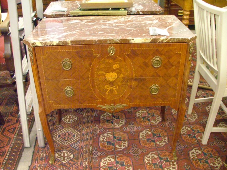 2 lådor, rosa stenskiva, intarsia. Bredd: 68 cm, d..//