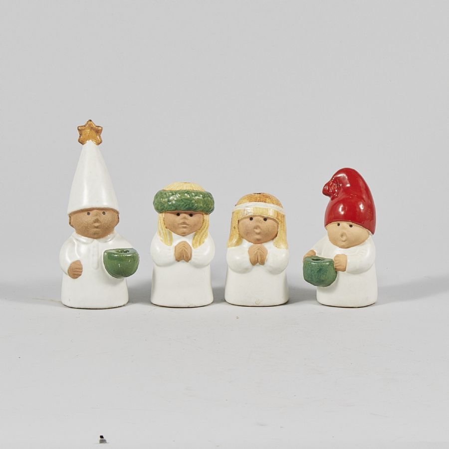 4 delar, Lisa Larson (f. 1931), Sverige. Luciatåg ur Advent, Rörstrand. Lucia, Tärna, Stjärngosse och Tomte. Stengods. Höjd: 10-17 cm