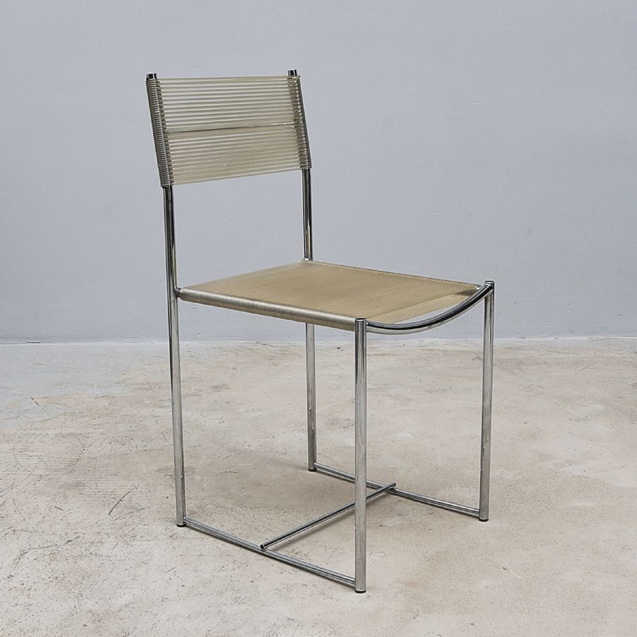 Giandomenico Belotti, Alias, Italien, "Spagetti Chair", underrede i kromat stål, sits och rygg i i plastremmar. Höjd: 85 cm, sitthöjd 45 cm. Bredd: 40 cm, etiettmärkt