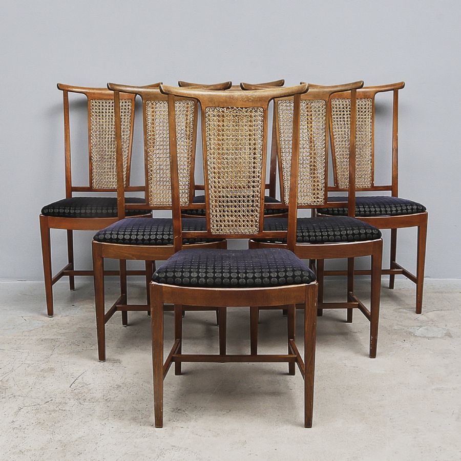 Stolar, 6 st, AB Svenska Möbelfabrikerna i Bodafors, 1950-tal, "Alf", stoppad sits, flätad ryggbricka i rotting, sitthöjd 45, höjd 97 cm