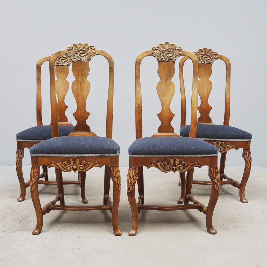 4 st, 1900-tal, rokokostil, benställning och rygg med skuren dekor, sits i velousammet